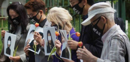 주미 한국대사관 앞에서 진행된 기독교 탈북자 가족 구출을 위한 평화시위에서 참가자들이 기도하고 있다