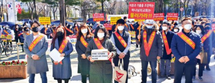 마스크를 착용하고 체온측정을 마친 대전 서구 관저동 주민 90여명이 22일 오전 10시 둔산동 서구청(청장 장종태) 앞에 모여들었다. 굳은 표정으로 ‘신천지 유사집단 하나님교회 건축 결사반대’ ‘장○○(교주) 집단 관저동에 발붙일 생각 마라’ 등의 문구가 적힌 띠를 어깨에 두르고 팻말도 들었다.