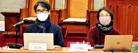 정경일 새길기독사회문화원장과 조한혜정 연세대 명예교수가 8일 서울 종로구 한국기독교회관 조에홀에서 열린 토론회에서 반년간 주고받은 편지를 중심으로 발표하고 있다.